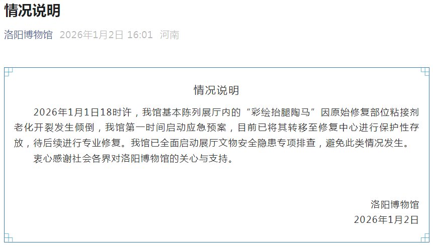 洛阳博物馆1月2日发布情况说明:2026年1月1日18时许,我馆基本陈列展厅内的“彩绘抬腿陶马”因原始修复部位粘接剂老化开裂发生倾倒,我馆第一时间启动应急预案,目前已将其转移至修复中心进行保护性存放,待后续进行专业修复。我馆已全面启动展厅文物安全隐患专项排查,避免此类情况发生。