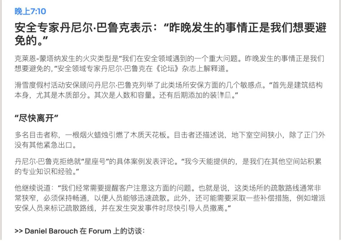 26年1月1日,瑞士瓦莱州克朗-蒙大拿镇“星座”酒吧发生重大火灾,被瑞士联邦主席帕姆兰称为“瑞士历史上最严重的悲剧之一”瑞士滑雪胜地跨年夜酒吧大火,40人死亡115人受伤,多数伤势严重,含多名游客。确认这是一起火灾事故,已排除恐怖袭击可能一位纽约游客拍摄到明亮的橙色火焰从酒吧中涌出,看到人们在黑暗中奔跑和尖叫,“当时烟花正在燃放,我们起初没明白发生了什么,然后我们看到了烟。这太可怕了,很多年轻人经常去那个酒吧”有目击者称,事发时他被一声巨响惊醒,“那声音可不像烟花” 瓦莱州进入紧急状态,设禁飞区,联邦宫降半旗五天,联邦主席取消新年致辞并慰问家属