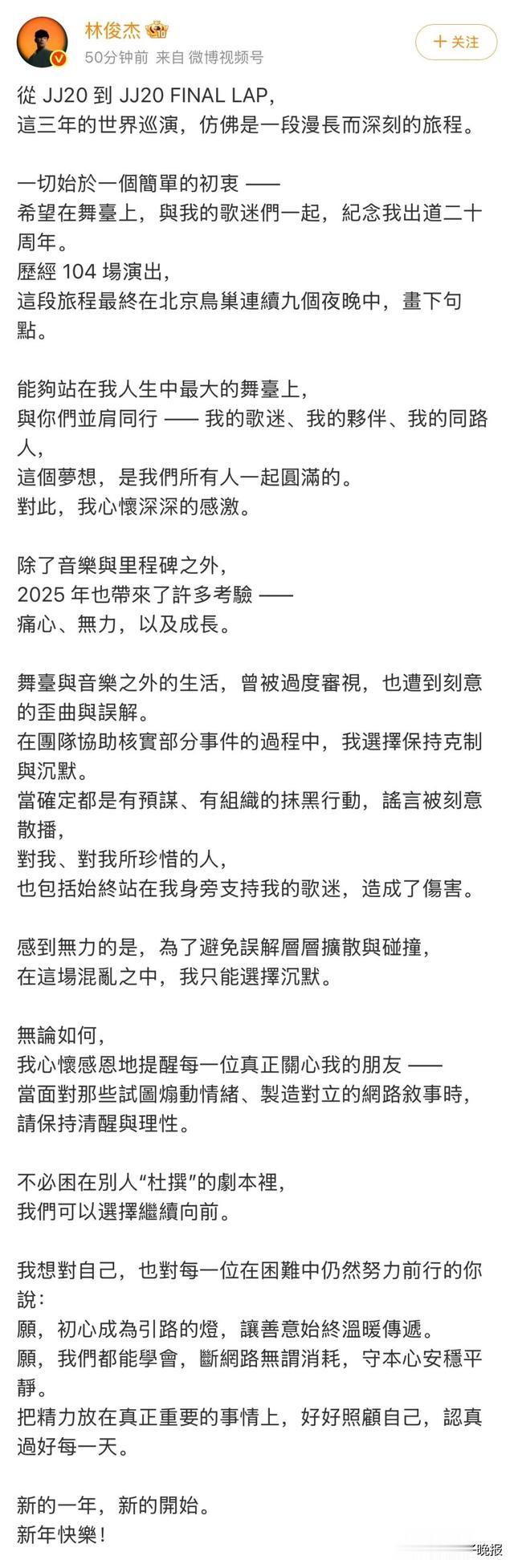 2025年12月31日,林俊杰于跨年夜在社交平台发文,回顾历时三年、共计104场的巡演圆满收官,他感谢并肩同行的所有人,还谈到2025年遭遇的网络风波,指其遭遇有组织抹黑,为免误解扩散曾选择沉默。