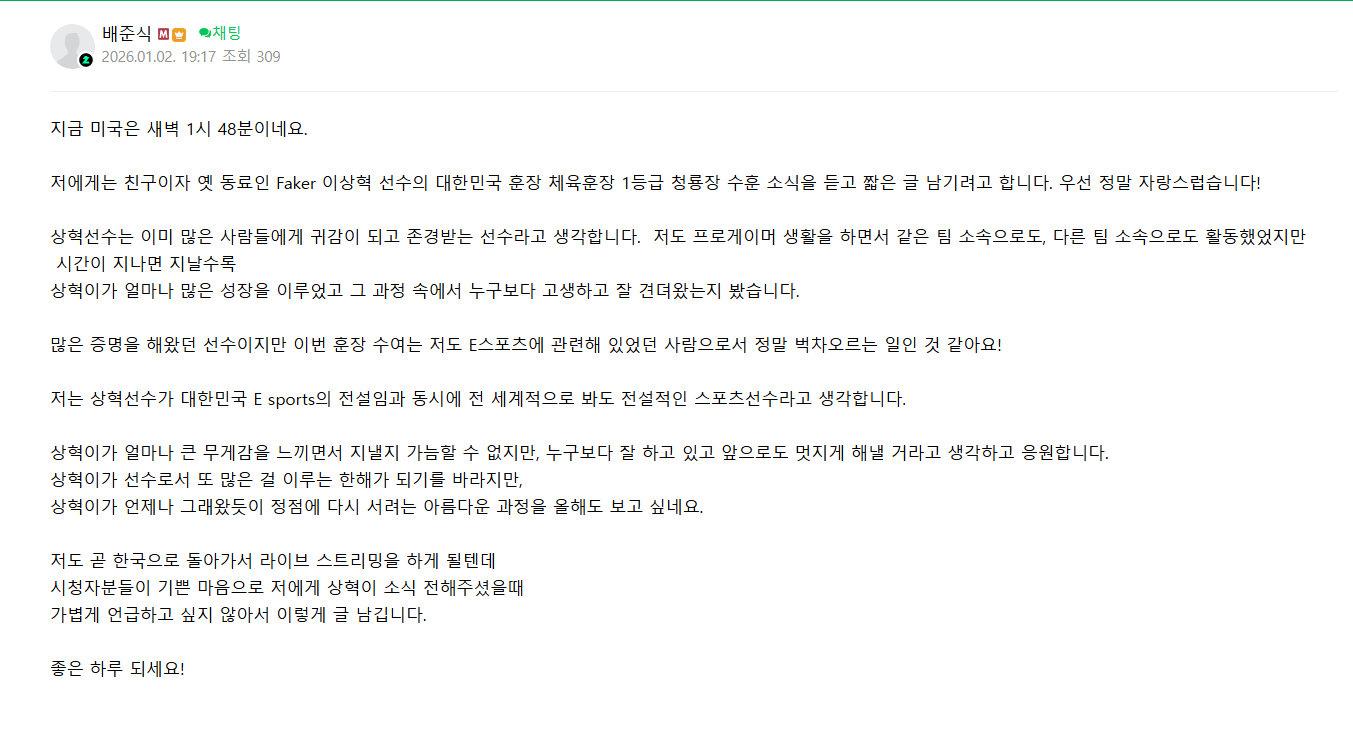对我来说,既是朋友也是前队友的Faker李相赫选手,获得了大韩民国体育勋章一等级青龙章这样的喜讯,我听到后想留下几句短短的话。