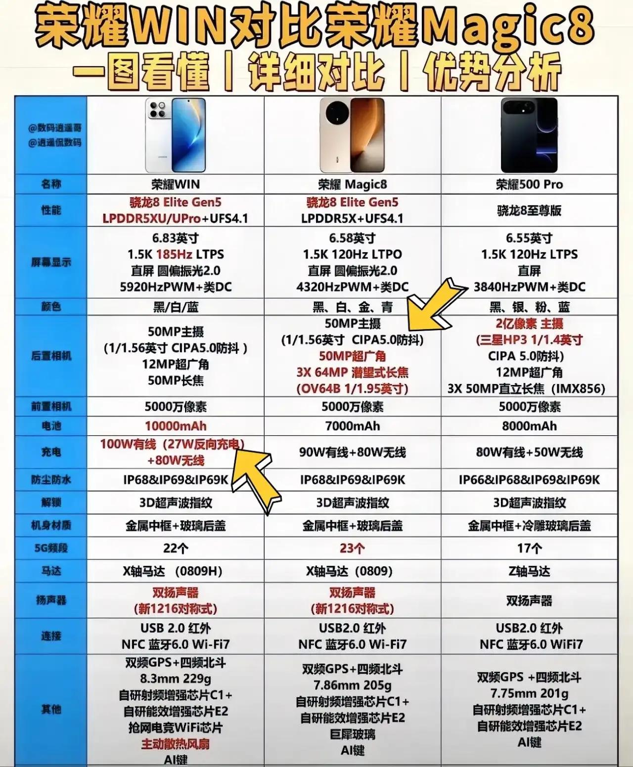 荣耀新机三连发,到底该选谁?一句话帮你理清: · 要拍照轻薄,闭眼入500 Pro,手感影像双赢。 · 图性价比+极致游戏,盯准荣耀WIN,性能调度够狠。 · 追求面面俱到的旗舰体验,直接上Magic8,堆料稳、体验足。 别光看参数,日常用500 Pro往往最扎实;Magic8虽全能,但价格也上去了。建议想清楚自己最常拍的场景、最在意的点——线下真机摸一圈,答案自然有。