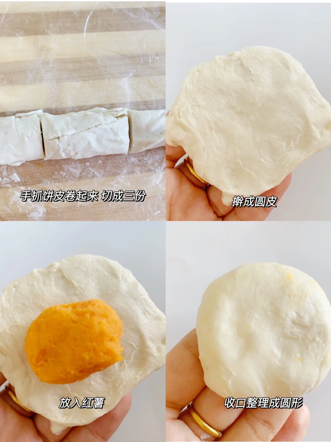 2⃣️把手抓饼皮卷起来,切成3份,擀成饼皮,放入红薯馅包裹起来压成圆饼