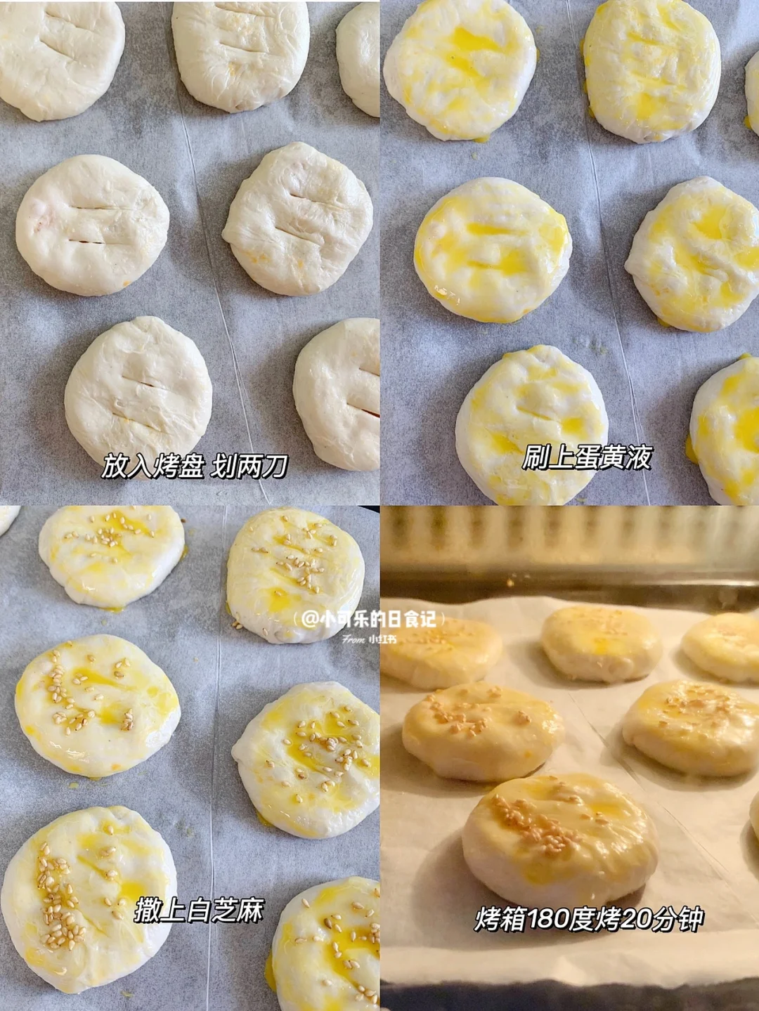 3⃣️烤盘放上油纸,放入烤盘中,红薯饼中间划两刀,刷上蛋黄液,撒上白芝麻
