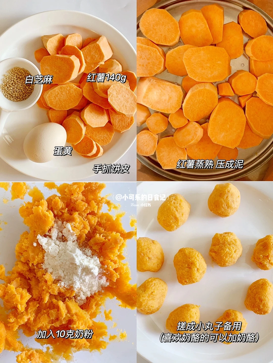 1⃣️红薯去皮切小块,上锅蒸熟,压成泥,加入10克奶粉,搓成小丸子(喜欢奶酪的话把奶酪包在红薯馅里)