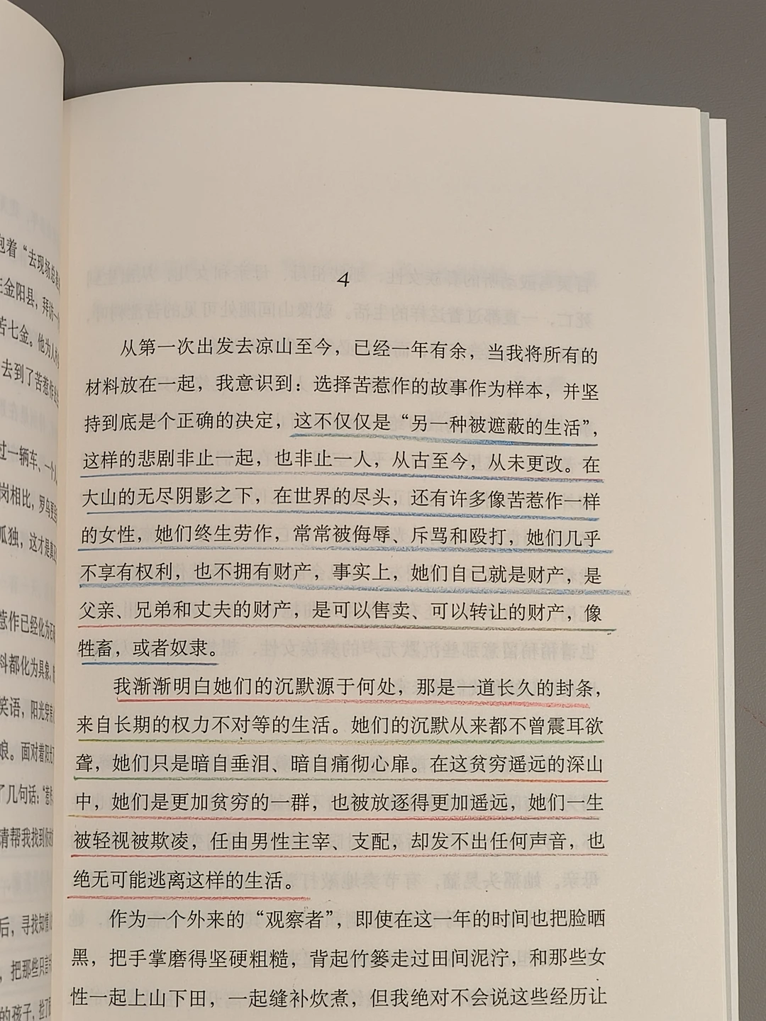“我渐渐明白她们的沉默源于何处,那是一道长久的封条,来自长期的权力不对等的生活。她们的沉默从来都不曾震耳欲聋,她们只是暗自垂泪、暗自痛彻心扉。在这贫穷遥远的深山中,她们是更加贫穷的一群,也被放逐得更加遥远,她们一生被轻视被欺凌,任由男性主宰、支配,却发不出任何声音,也绝无可能远离这样的生活。”