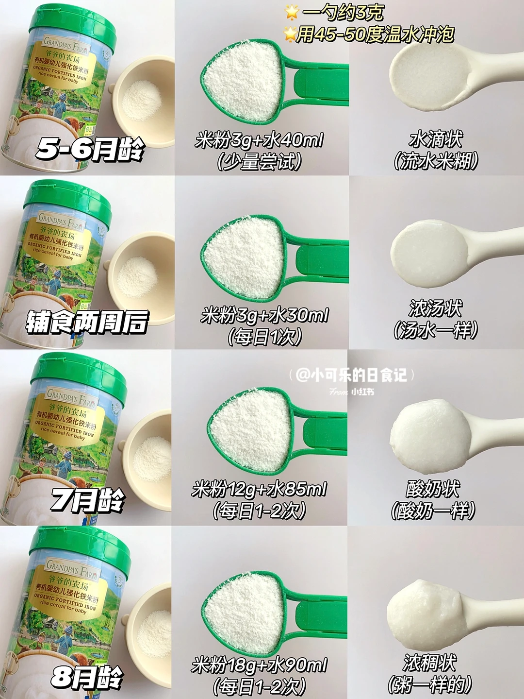 具体冲泡可看图片,我用的爷爷的农场大米粉,铁含量高达5.8mg,还是二价铁搭配维生素C,有机大米,口感细腻,很容易冲泡,也不会起小疙瘩,合适做为宝宝第①口米粉。