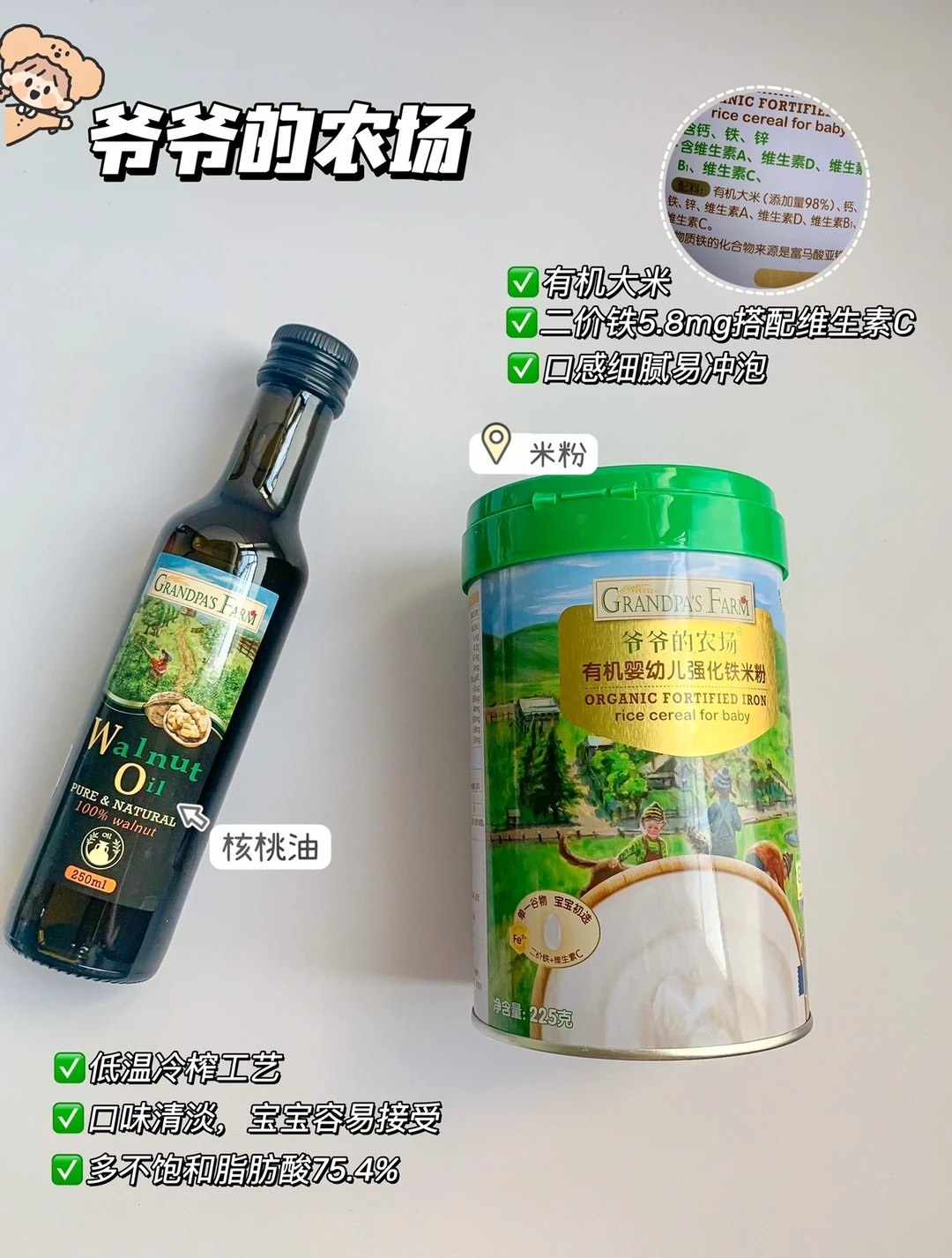 🌈我用是爷爷的农场核桃油,低温冷榨工艺,多不饱和脂肪酸高达到75.4%,口感清淡,宝宝容易接受。棕色避光玻璃瓶,搭配伸缩油嘴,方便控油不用担心过量的问题,拌米糊、粥、面条都可以。