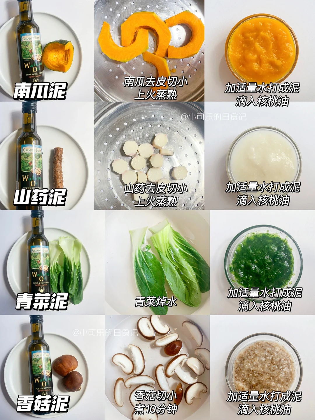 南瓜泥+土豆泥+香菇泥+青菜泥+米粉+核桃油
