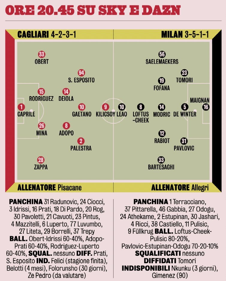 【基本上预计先发就这样了👉】 🔴⚫️ 目前天空体育和米兰体育报给出的2025-26赛季意甲联赛 第18轮米兰客场对阵卡利亚里队「最新预计首发阵容」(3511),完全保持一致。sempremilan