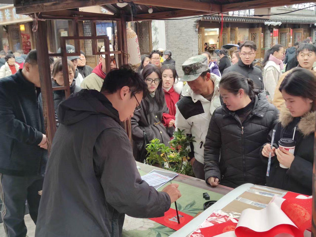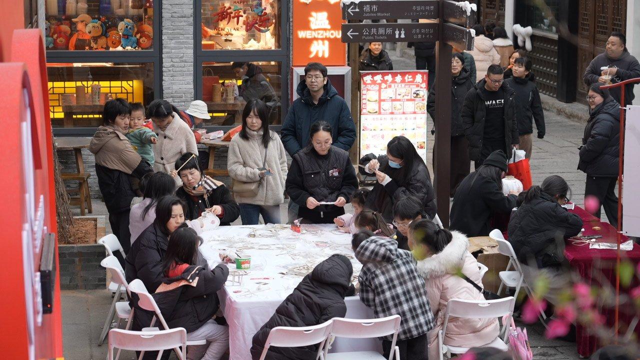 下午时分,寺前街北市打卡处聚集了不少家庭,孩子们在家长陪伴下亲手制作花草灯与手作徽章,体验传统手工艺的乐趣。南广场的“挥春送福”活动前也排起小队,市民纷纷领取手写春联,为家中添上一份墨香年味。