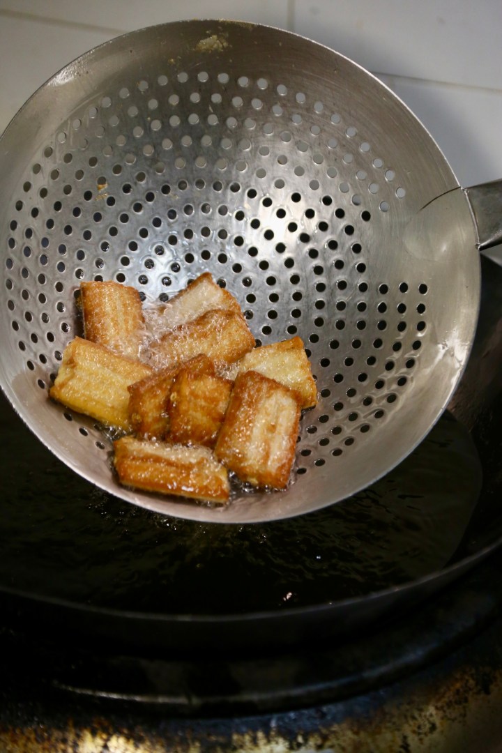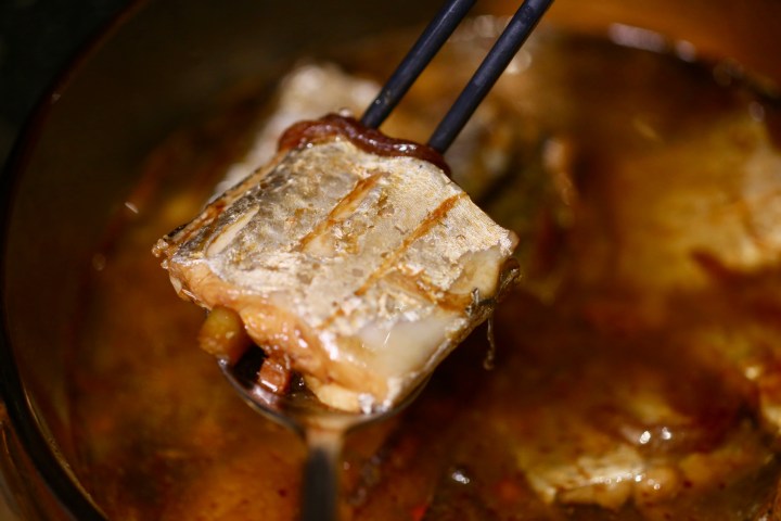 且不说带鱼经过油炸或油煎仍保持着丰腴的体态,需要好的鱼和好的技术,再就是丰富的调味料突出葱香,而鱼肉也要在相对重口味的调味料夹击之下,最大限度地稳住自己固有的新鲜感。这一版干烧带鱼的汤汁,用来淘饭吃真真是极好的。