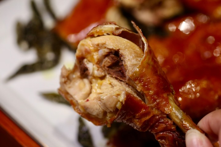 当然,吴主厨的炫技不仅限于海鲜类,前段时间在他的视频号上围观了一只每天限量供应的脆皮鸡,是粤菜的做法,所有的工序都说得明明白白,调料的配方也写得清清楚楚,最后的成品隔着屏幕都觉得香。所以在11种带鱼菜的围堵之下,脆皮鸡还是凭借玻璃感十足的表皮和汁水丰富的鸡肉,为自己博得一席之地。