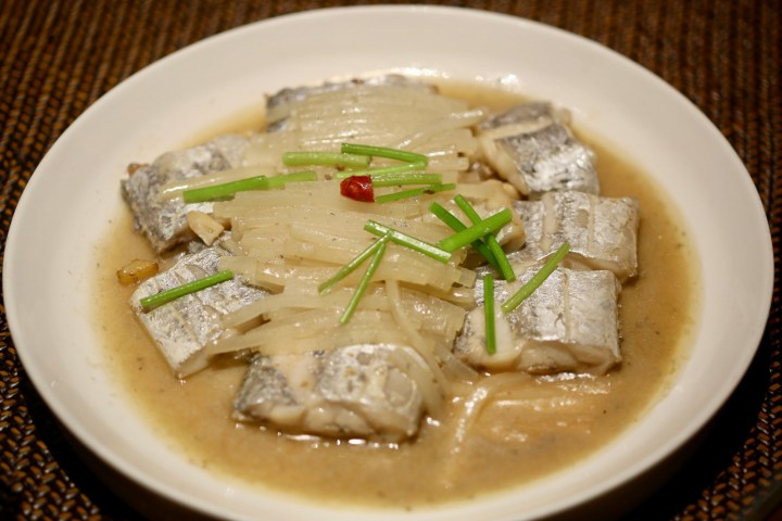 琉璃带鱼烧萝卜丝是具有代表性的台州菜,家家户户都在做,铁定鲜用的萝卜有点不一般,清甜感几乎要赶上盘菜了。而这盘带鱼的表皮是保持得最完整的,依然银光闪耀。
