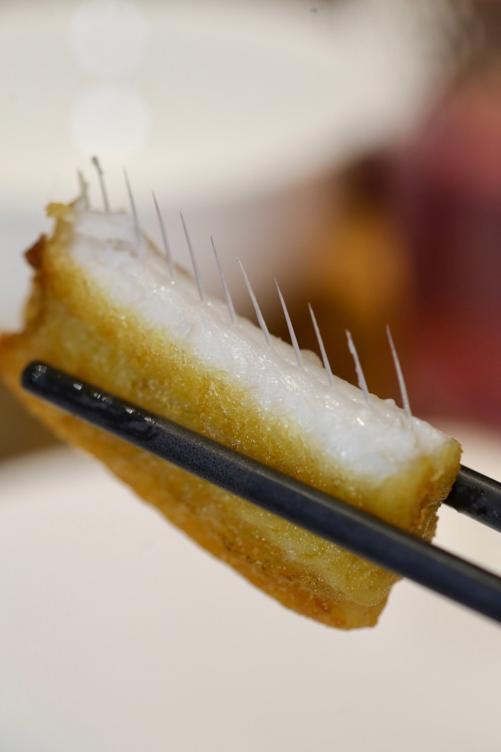 在很长一段时间里,我们对台州菜的理解是清蒸、白灼小海鲜,复杂一点的就家烧,味形相对单一。只是在看似单一的背后,自有他的娴熟技法。第一场技法的集中展示,是去年做的“钱塘江米鱼十三吃”,当时用到的米鱼很大,所以连脊椎骨都成为一个重点项目:将大鱼的脊椎骨取出来,切成段处理干净,先烤干,再炖六个小时,成就了“五指仙露煨鱼皇”这道神仙级汤品。