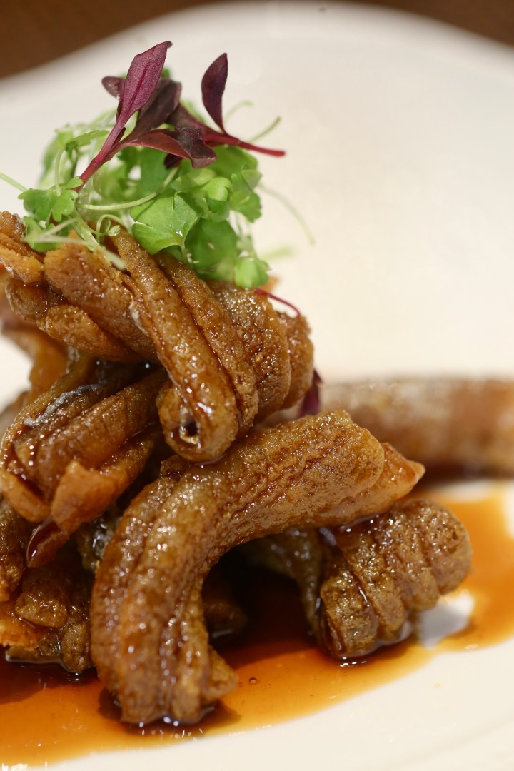 热菜中最受好评的是御品干烧带鱼,说来神奇,仿佛一夜之间大家都在做干烧鱼,不单是省内,隔壁江苏的明星主厨也在发圈。所谓干烧,简单来说就是先煎(或者炸)后烧,要把汤汁几乎烧干(所以经常只剩下油)从而让鱼肉酥软入味。老底子,物流不发达、储存方式也不先进,干烧鱼是应对那些已经没那么新鲜的鱼,但如今,主厨也会用优质的鱼来做干烧。
