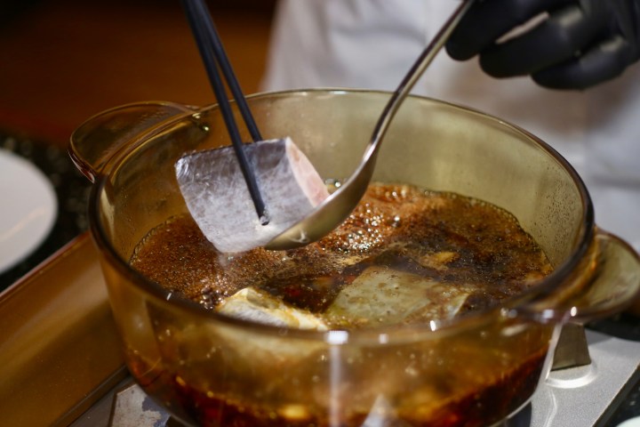 另一个没想到的组合是古法糟卤烧带鱼,有点平湖糟卤的香气,激发出提前腌制过的带鱼肉之咸鲜。