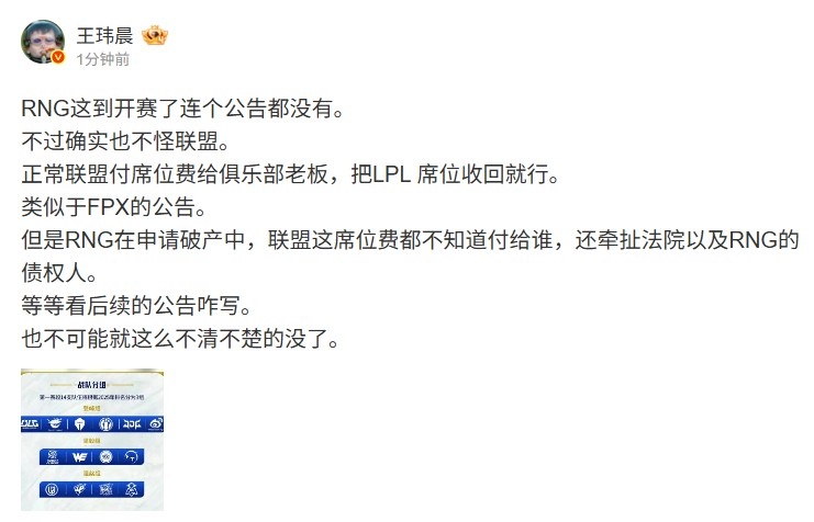 但是RNG在申请破产中,联盟这席位费都不知道付给谁,还牵扯法院以及RNG的债权人。