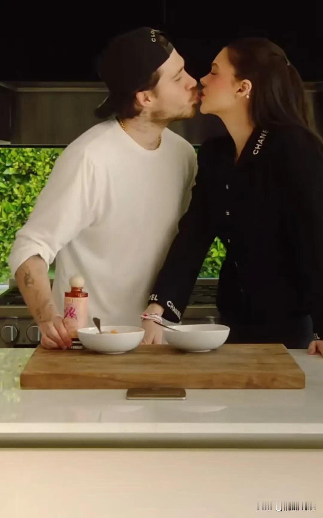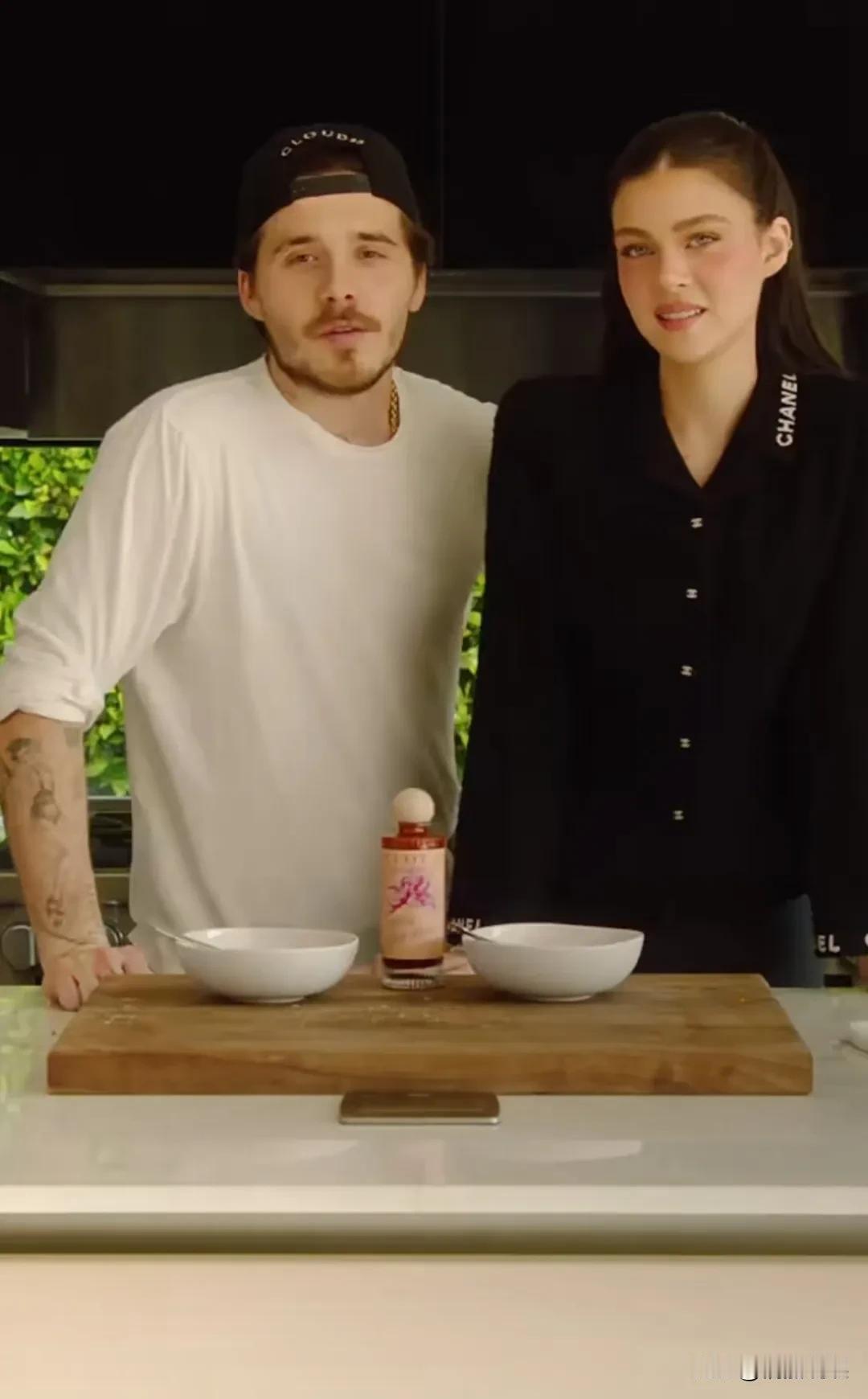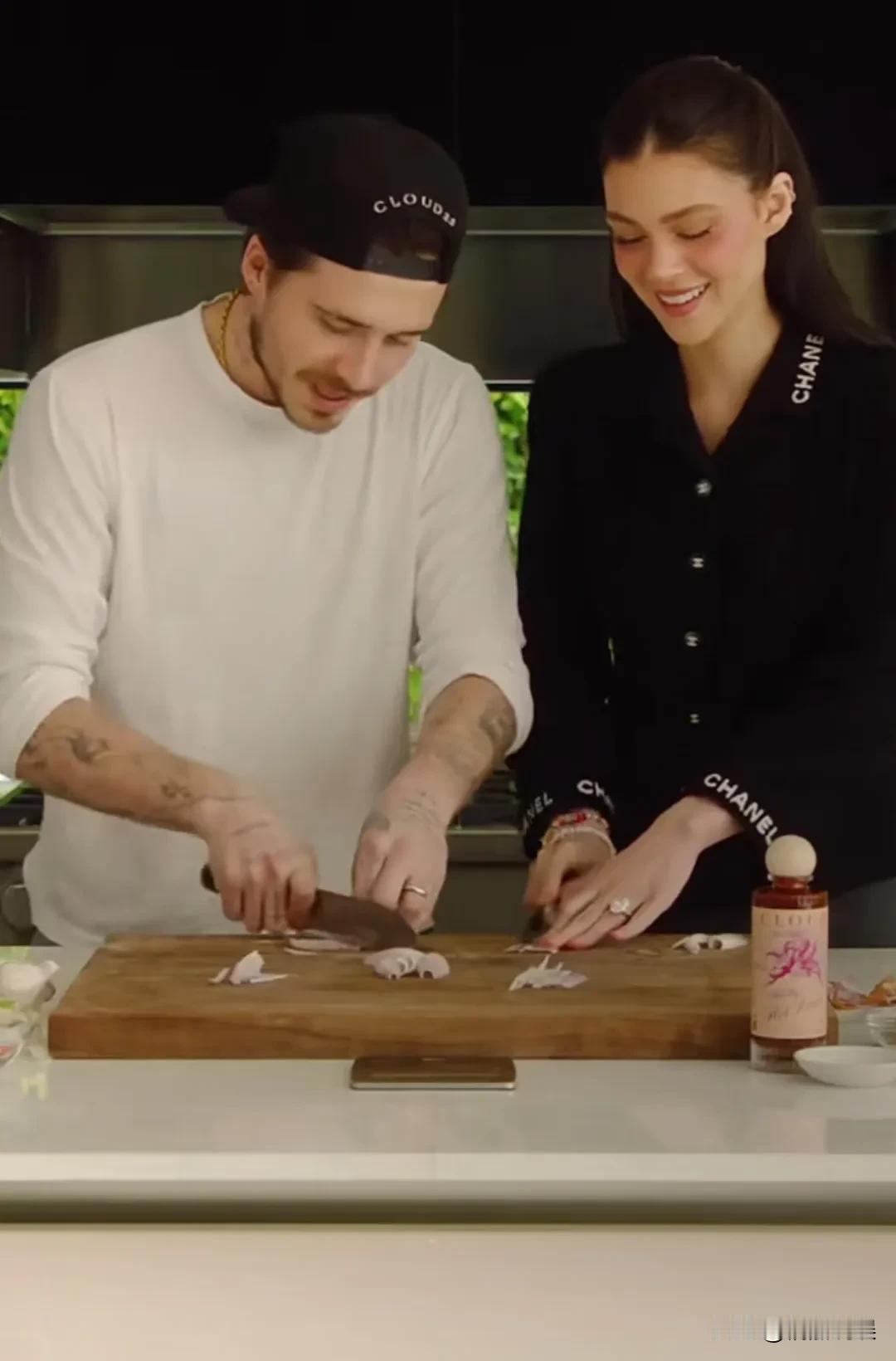 贝克汉姆大儿子布鲁克林晒视频,和老婆一起做美食,看起来是拌面条。 布鲁克林反戴着棒球帽,穿着白色长袖,留着络腮胡子,胳膊上有大片纹身,眉眼更像妈妈维多利亚,没有爸爸年轻时帅气, 他老婆妮可拉打扮得很漂亮,一头褐色的长发又直又顺,五官精致,唇红齿白,笑靥如花,是个高挑又时尚的美女。 洗菜、切菜、煮面,调味全程都是布鲁克林,他切洋葱还被熏得流眼泪。但是看他做美食是全程投入,真的非常享受的样子。 从他的表情、眼神和肢体动作,我隔着屏幕都能感觉到,他爱死了他老婆。