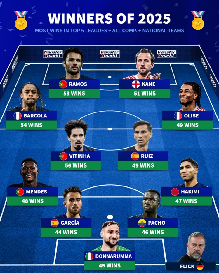 直播吧1月3日讯德国转会市场统计了2025年五大联赛球员俱乐部+国家队的胜场数量,并列出胜场最多阵容,凯恩、奥利塞、阿什拉夫在列。
