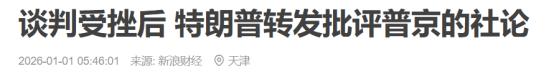 特朗普拍醒俄罗斯人!2026年1月1日报道,谈判受挫后,特朗普转发批评普京的社论!特朗普:就算是出卖了中国,美国也不可能放过! 特朗普在重新执政,担任美国总统之后,就强势干涉了俄乌冲突。为了能够确保在他的促使下,俄乌冲突停火,特朗普采取了很多实际措施。 例如针对俄罗斯实施的制裁,在今年7月底8月份的时候.美国针对俄罗斯展开了多方面的制裁,并发出了多则威胁。 特朗普的这一举动,在极大地推动俄罗斯向我国靠拢。中俄两国关系虽然本就非常深厚,但在美国的这一促使下,两国关系更进一步得到了发展。 特朗普用自己的实际行动向俄罗斯传递着一个信号,就算俄罗斯出卖中国,美国也不会放过俄罗斯。 就在2026年1月1日的时候,在2026年的第一天,据媒体报道。特朗普在谈判受挫之后,转发了批评普京的社论,以此来表示自己对普京的不满。 特朗普的此举引起国际关注,针对此次同俄罗斯以及乌克兰举行的会谈。起初的时候,特朗普表示的非常乐观。但随着时间的流逝,这场谈判最终又走上了“死局”。 俄罗斯调整了谈判立场,对乌克兰做出的一些指控,进一步促使俄乌关系紧张。特朗普在表达出对普京的不满,国际普遍关注特朗普是否会像以前一样,去针对俄罗斯发出采取一些制裁等。 所以对于俄罗斯来说,在变化无常的美国面前,同中国打好关系极其重要。对此,您怎么看?欢迎评论区留言您的看法,我们一起讨论一下。 (信息来源:谈判受挫后 特朗普转发批评普京的社论-新浪财经)