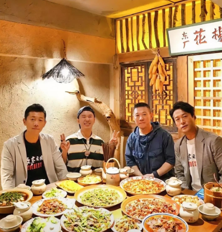 仔细看,一桌美味佳肴,提不起谭凯,夏雨兴趣,而身穿白底黑条纹衬衫耍萌傻笑的C位男士是谁?感觉格格不入!能与谭凯、夏雨一起合影真不简单!他也是演员吗?有谁认识?
