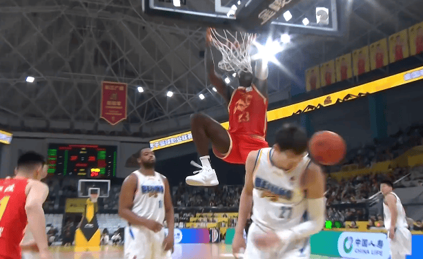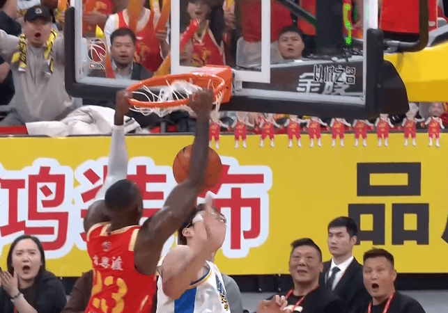 第二节比赛中,桑普森隔着周琦双手补扣得手,广厦领先10分打停北京。