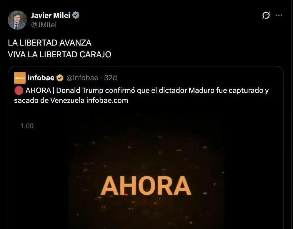 特朗普这边刚动手拿下了马杜罗夫妻。 阿根廷的米莱居然是第一个跳出来道贺的。 我一开始以为他顶多私下跟对方递个话,没想到直接明着说这是“自由在进步”。 之前说他是南美版特朗普,这下算是彻底坐实了名号。 这次美军的行动更离谱,从头到尾没闹出一点伤亡,堪称光速速战速胜。 抢着站在最前面表态的人,心里打的到底是什么算盘