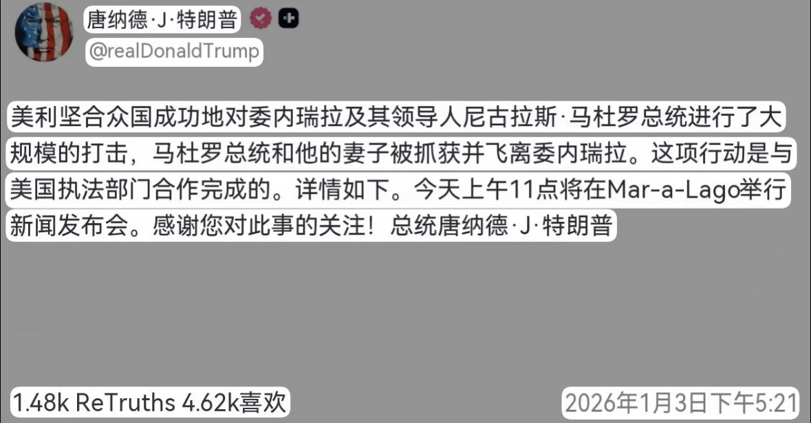 央视新闻报道称,当地时间1月3日凌晨,美国对委内瑞拉境内发动空袭,美国总统特朗普随后证实,美方已成功实施大规模打击,委内瑞拉总统马杜罗及其夫人已被抓获并带离该国特朗普通过社交媒体宣布,此次行动系与美国执法部门联合进行,马杜罗夫妇目前已被美方控制并乘飞机离开委内瑞拉。特朗普透露,更多细节将陆续公布,并定于当地时间1月3日上午11点在海湖庄园举行新闻发布会加拉加斯等地凌晨传爆炸声与防空警报,委政府谴责美方“军事侵略”宣布全国紧急状态与宵禁,马杜罗下令部署防御指挥部并号召武装斗争,副总统要求美方提供马杜罗生存证明与下落