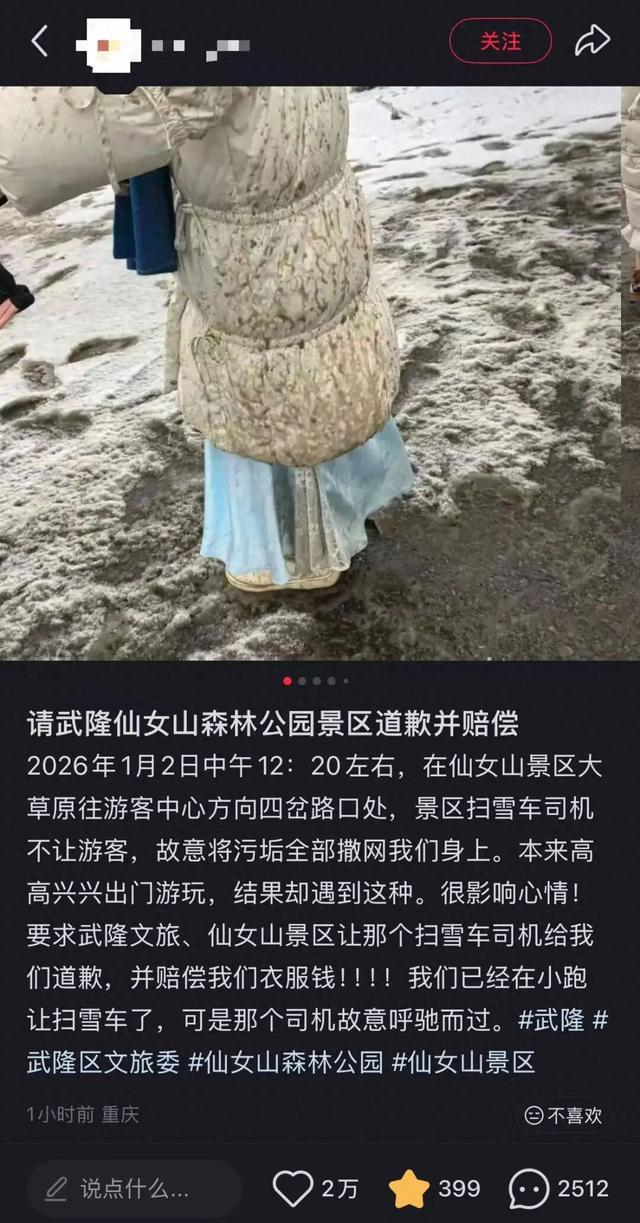 1月2日,有网友发帖称,在重庆仙女山国家森林公园景区,扫雪车司机故意加速驶过,把地上的污垢溅到了自己与同伴的身上,此帖引发网友热议。