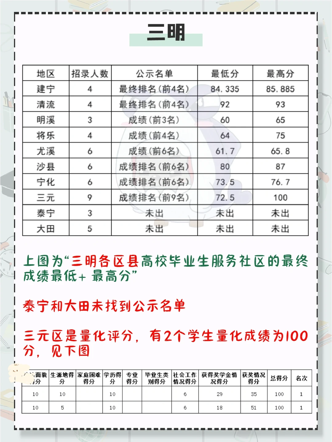 2022福建高校毕业生服务社区多地有公示成绩排名,让我们来看看今年多少分可以入选,具体见上图 [樱花R]已出地区有:福州、漳州、龙岩、南平、三明、平潭(泉州、宁德、莆田貌似未出) 🔥可怕的是,三明三元区量化有2个100分,具体见图8