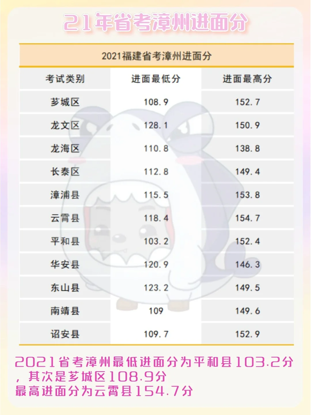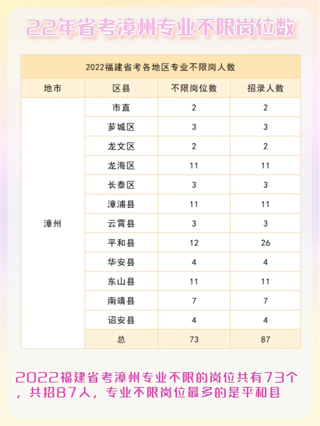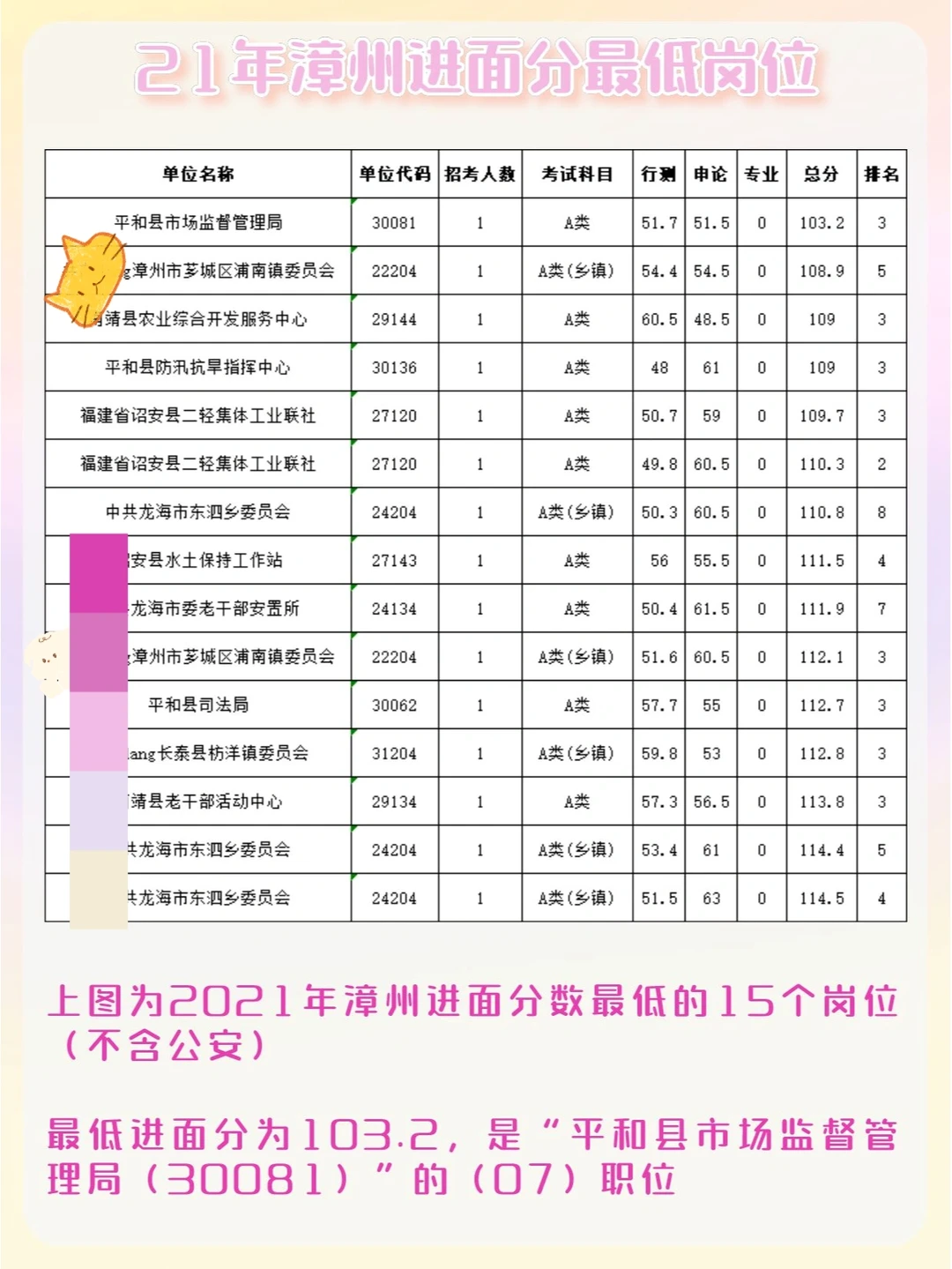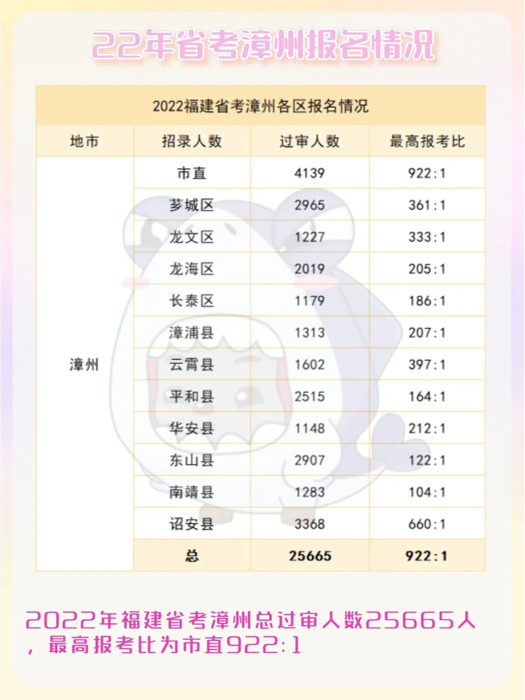 2022福建省考漳州共招410人,招录最多的地区是平和县79人 🌟2022省考漳州总报名人数25665人,最高报考比为市直922:1,是“(21090) 漳州市数字漳州建设中心”的“(01) 一级科员”岗位;报考比排第二的是诏安660:1,是“(27143) 诏安县水土保持工作站”的“(02) 一级科员”一岗 🌟2021省考漳州最低进面分为平和县103.2分,其次是芗城区108.9分(不算公安的) 🌟最低进面分岗位是“平和县市场监督管理局(30081)”的(07)职位