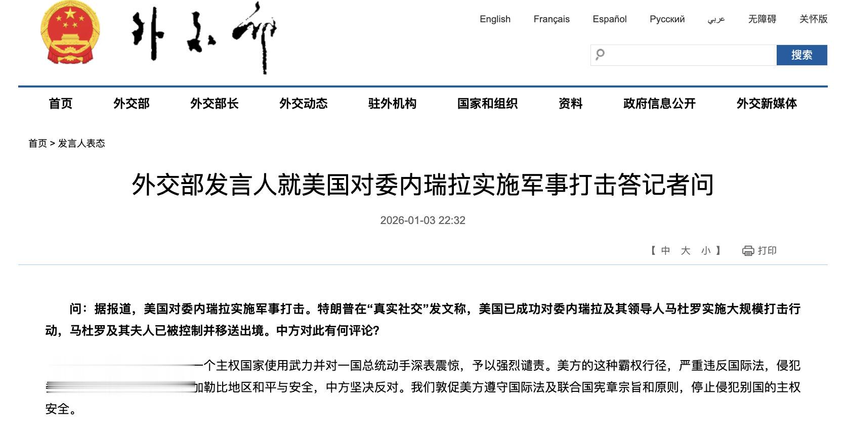 问:据报道,美国对委内瑞拉实施军事打击。特朗普在“真实社交”发文称,美国已成功对委内瑞拉及其领导人马杜罗实施大规模打击行动,马杜罗及其夫人已被控制并移送出境。中方对此有何评论?
