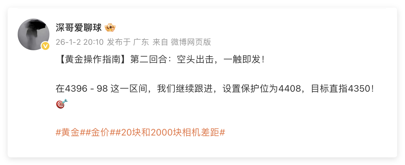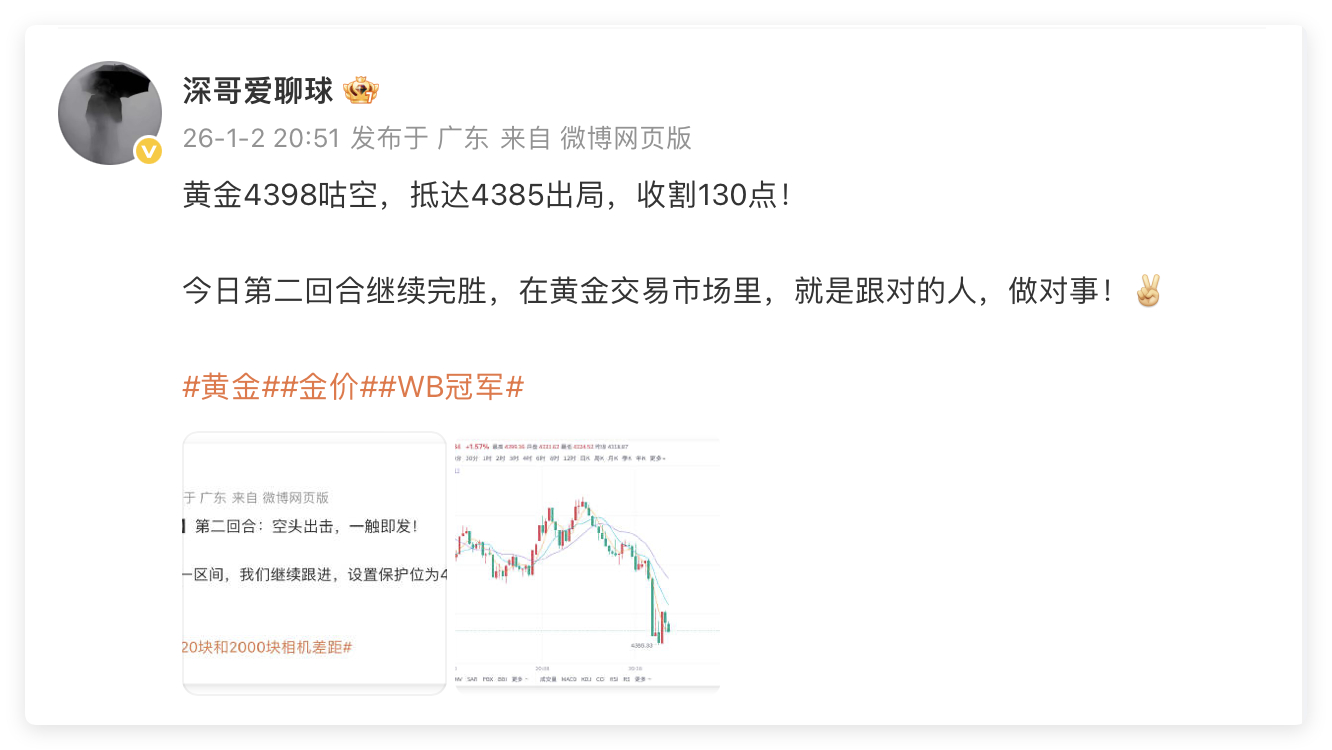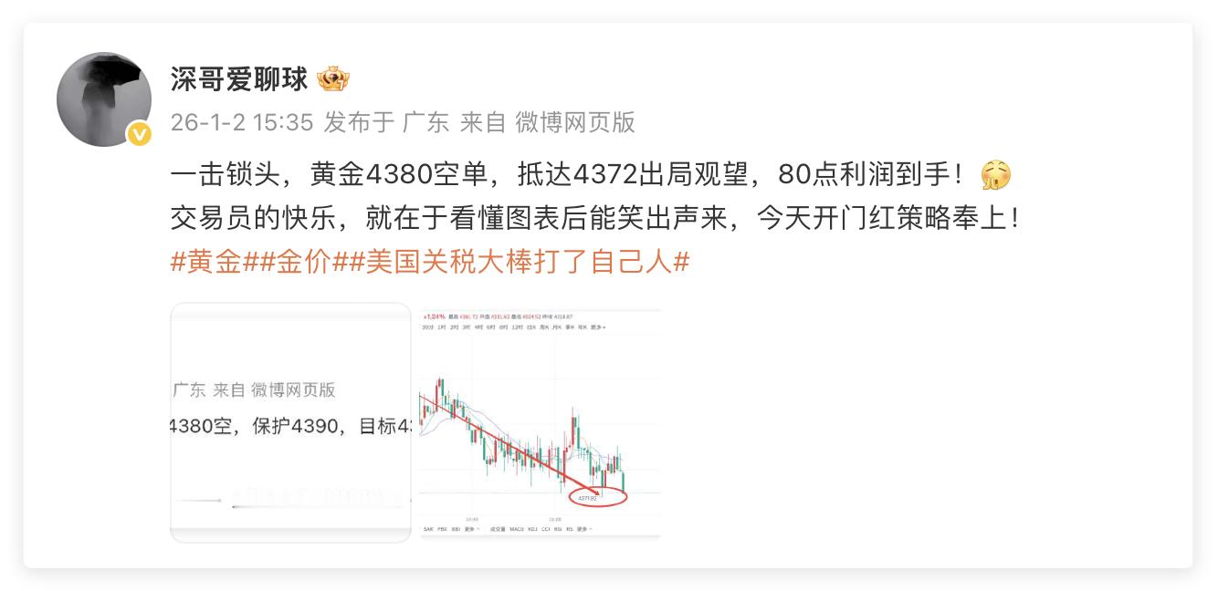 1月2日交易回顾:单日战绩210点黄金4380空单,抵达4372出局,获利80点黄金4398空单,抵达4385出局,获利130点战场打扫完毕,两单部署稳定的输出和发挥,该拿的盈利拿到手,也是深哥对大家的交代,让大家揣着盈利过周末。行情再复杂,只要策略到位、执行果断,就能从市场里稳稳分一杯羹。不用羡慕别人的暴利神话,咱们要的是稳稳的幸福,是一笔笔看得见的收益,是靠着稳健操作,一步步朝着目标迈进。