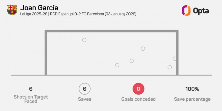 据Opta统计,霍安·加西亚本场比赛做出6次扑救,2023年11月特尔施特根对阵皇家社会之后,他是首位西甲单场6次扑救+零封的巴萨门将。