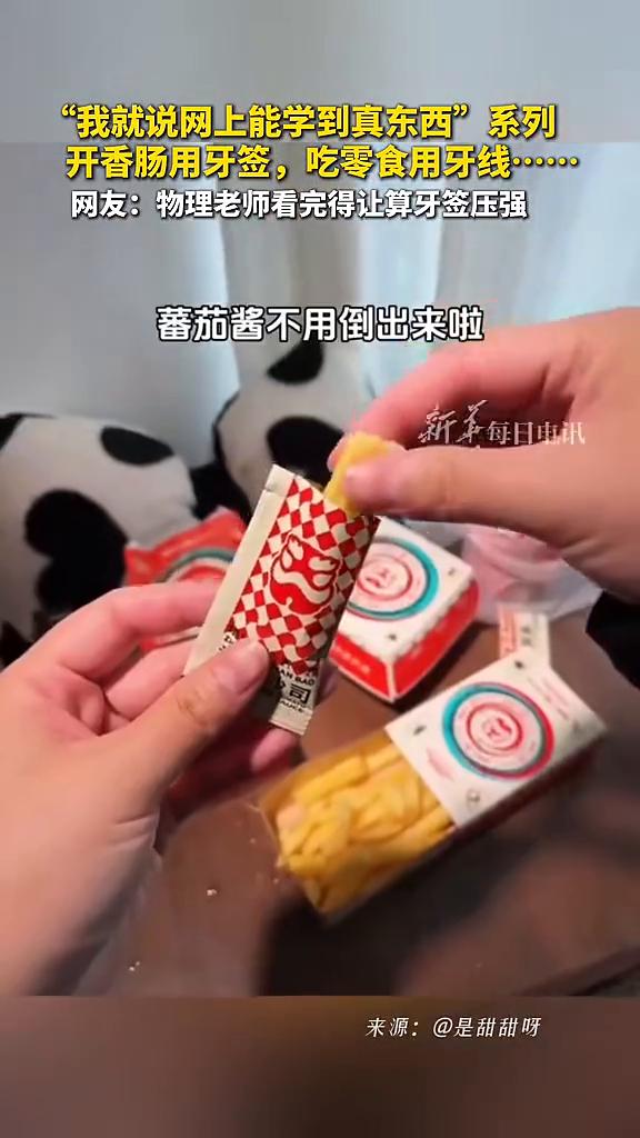 "我就说网上能学到真东西"系列:开香肠用牙签,吃零食用牙线。 新华每日电讯。 网友:物理老师看完得让算牙签压强。以后开火腿肠,你只需要把肠对折一下,然后用牙签扎一下,就能轻松撕开了,真的很方便。柠檬不用切,还可以原榨!蕃茄酱不用倒出来啦。外出吃饭的时候,没有手机支架怎么办?保鲜膜增加摩擦力,轻松拧开!