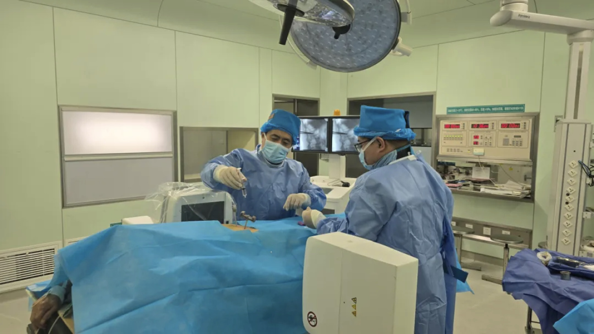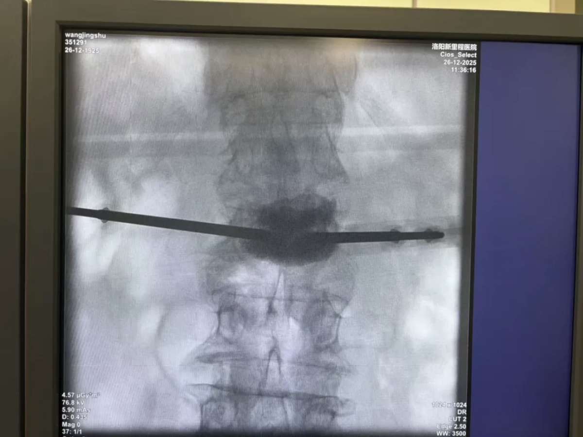 手术由康辉主任主刀。团队通过C形臂X光机精准定位,经皮肤穿刺将特制球囊送入骨折椎体,扩张球囊恢复椎体高度,再注入“骨水泥”稳定骨折。整个过程仅耗时约40分钟,患者生命体征平稳。