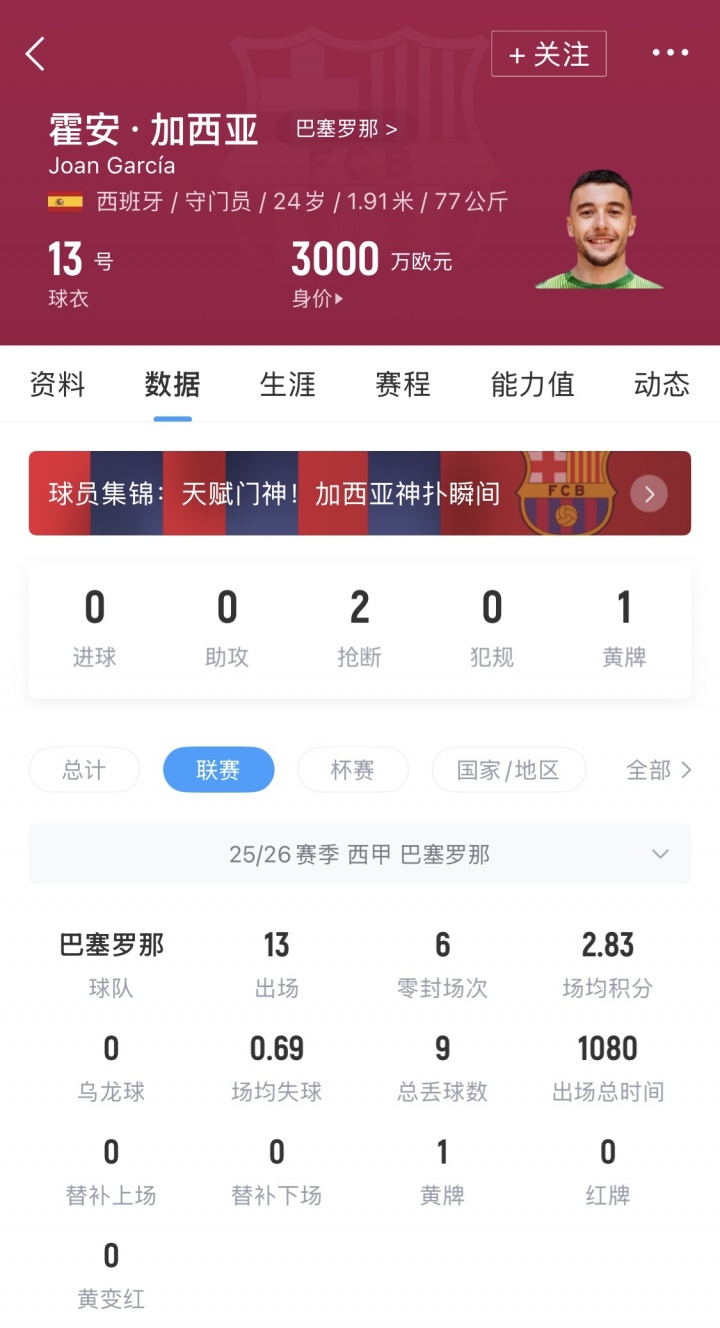 国家队何时征召?24岁霍安·加西亚西甲13场6零封,巴萨十年无忧
