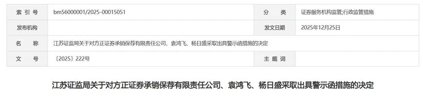 近日,江苏证监局公布《关于对方正证券承销保荐有限责任公司、袁鸿飞、杨日盛采取出具警示函措施的决定》。经查,方正证券承销保荐有限责任公司作为江苏京源环保股份有限公司(688096)2022年可转债持续督导保荐机构,在履行持续督导职责过程中未尽到勤勉尽职义务,未发现京源环保存在违规使用募集资金支付非募投项目费用、募集资金信息披露不准确等问题。保荐代表人袁鸿飞、杨日盛应当对上述违规行为承担主要责任。