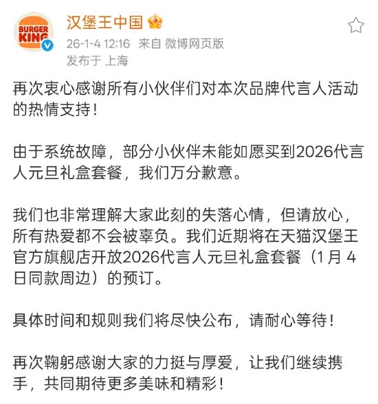 随后,汉堡王中国再次发文致歉表示:由于系统故障,部分小伙伴未能如愿买到2026代言人元旦礼盒套餐,我们万分歉意。我们也非常理解大家此刻的失落心情,但请放心,所有热爱都不会被辜负。我们近期将在天猫汉堡王官方旗舰店开放2026代言人元旦礼盒套餐(1月4日同款周边)的预订。