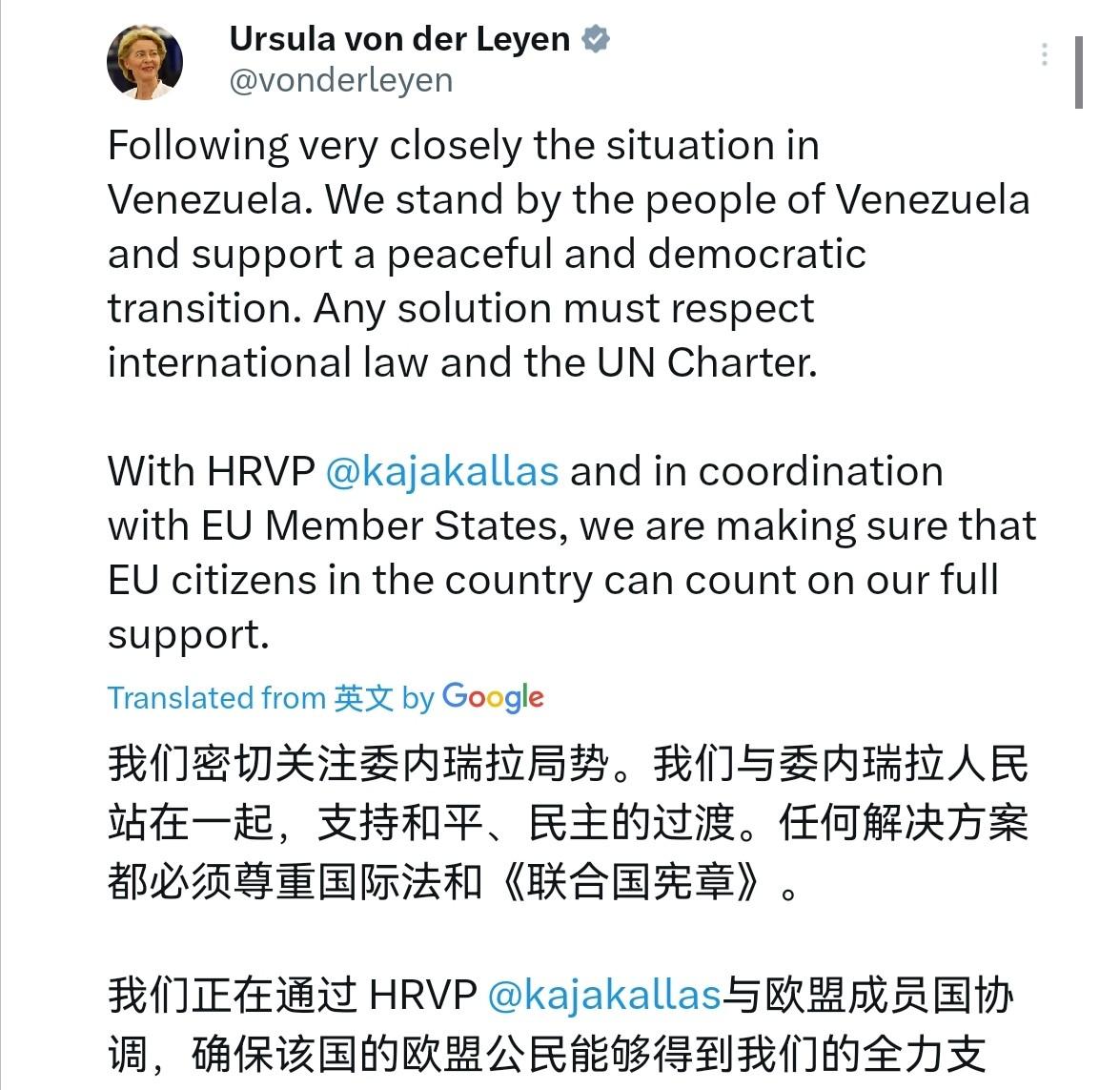 欧盟委员会主席冯德莱恩出来表态了!1月3日,冯德莱恩表示欧盟正密切关注委内瑞拉局势,强调支持委内瑞拉人民通过和平民主方式实现政权过渡,并指出任何解决方案都需遵守国际法和《联合国宪章》,她透露正与欧盟外交与安全政策高级代表卡拉斯保持沟通,同时协调各成员国立场。 从表面观之,欧盟此次表态重申了对委内瑞拉人民的声援,然而,深入剖析便会发现,其实质上在刻意规避对美国军事威慑的直接谴责,背后似有隐情。 欧盟外交与安全政策高级代表卡拉斯与美国国务卿鲁比奥的紧急通话记录显示,欧盟虽强调"国际法原则必须得到尊重",却未对美国司法部长邦迪宣布的"马杜罗夫妇涉嫌毒品恐怖主义"指控提出质疑。 这种选择性沉默暴露出欧盟在地缘冲突中的战略困境,既想维护多边主义形象,又难以割舍与美国的传统盟友关系,形成"既想当裁判员,又想做运动员"的矛盾姿态。 委内瑞拉国内局势正陷入"权力过渡混乱、军方立场分化、社会动荡加剧"的复合危机,根据最新局势推演,临时政府可能由副总统德尔西·罗德里格斯按宪法暂代职权,但军方高层与基层部队的忠诚度存在严重分裂风险。 加拉加斯已出现局部停电、通信中断等准战争状态迹象,反对派内部则因领导权争夺陷入派系内斗。 更严峻的是,美国对马杜罗的司法追诉可能引发"政治绑架"的连锁反应,正如2019年欧盟曾冻结马杜罗家族资产却未能阻止危机升级,历史正在重演。 这种"有利则用"的实用主义将削弱多边体系公信力,正如外交专家贲杰民·诺顿指出:"除非美国放弃霸权思维,否则丛林法则将持续蔓延,"欧盟在委内瑞拉问题上的矛盾立场,反映了多极化世界中的战略困惑,真正的民主转型必须由本国人民自主决定,而非外部强加。 欧盟若想成为负责任的国际行为体,需超越"选边站队"的惯性思维,推动建立包容性对话机制,未来30天将是关键窗口期,若临时政府能稳定核心城市控制,并通过国际监督实现有序选举,或可避免内战风险。 否则,委内瑞拉可能重演伊拉克式的资源争夺悲剧,国际社会更应警惕的是,当"石油美元"逻辑凌驾于国际法之上时,任何国家的能源安全都将面临系统性风险。 唯有构建基于规则的多极能源体系,才能避免"工业血液"成为战争导火索,这场危机最终考验的,不仅是委内瑞拉人民的智慧,更是国际社会守护多边主义的决心。