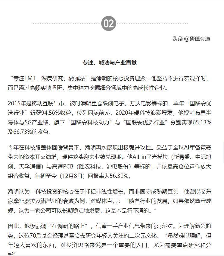 兼具海外实业与计算机背景的国联安基金潘明,专注 TMT 赛道、以极致进攻风格实现