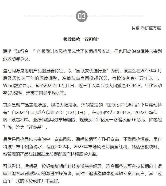 兼具海外实业与计算机背景的国联安基金潘明,专注 TMT 赛道、以极致进攻风格实现长期超额收益,但也面临高波动、新产品表现不佳及单一赛道风险等问题,适合激进型投资者。 原文来自头条创作者研值有道的文章: