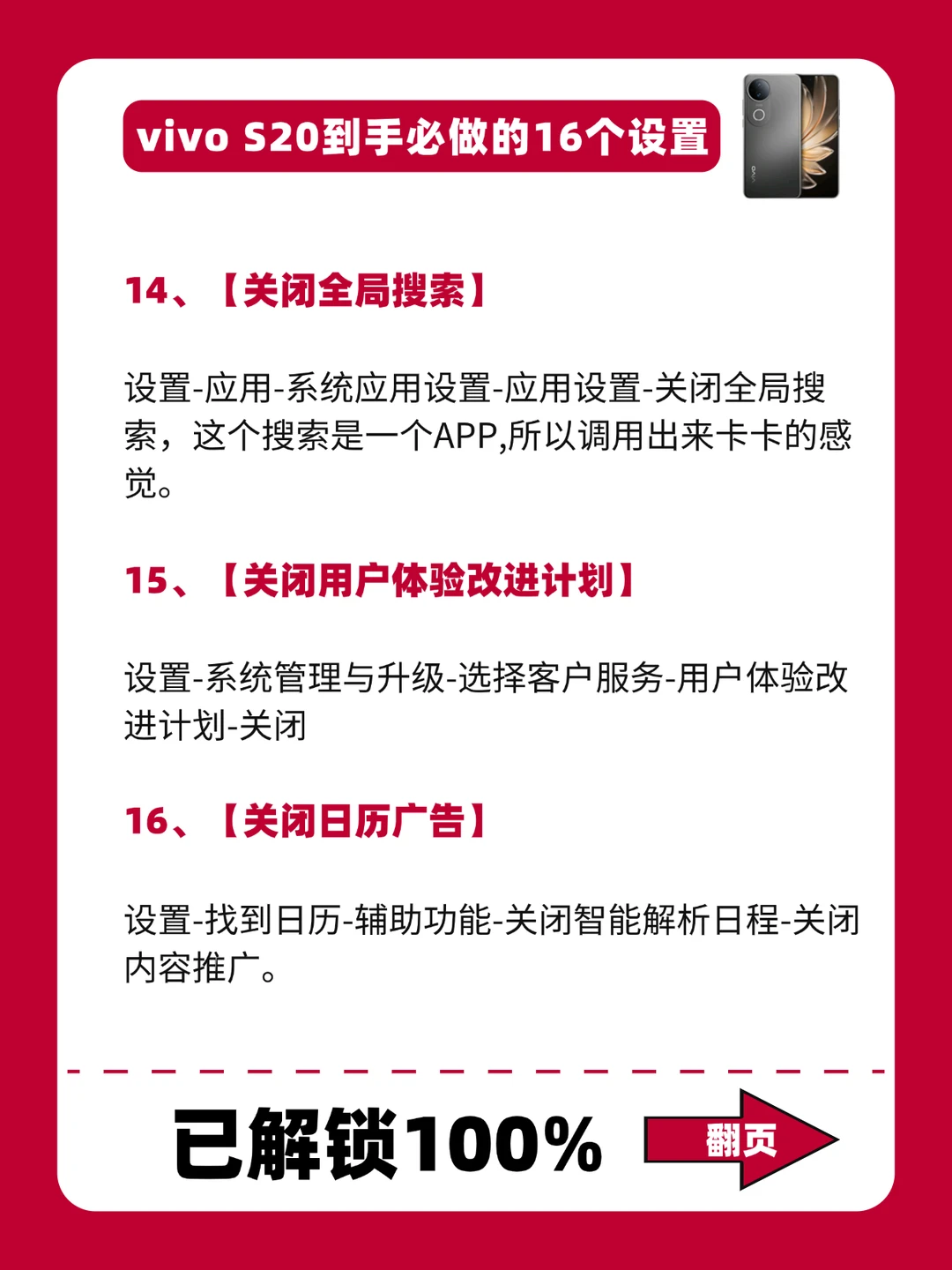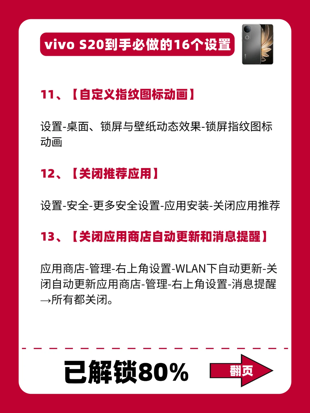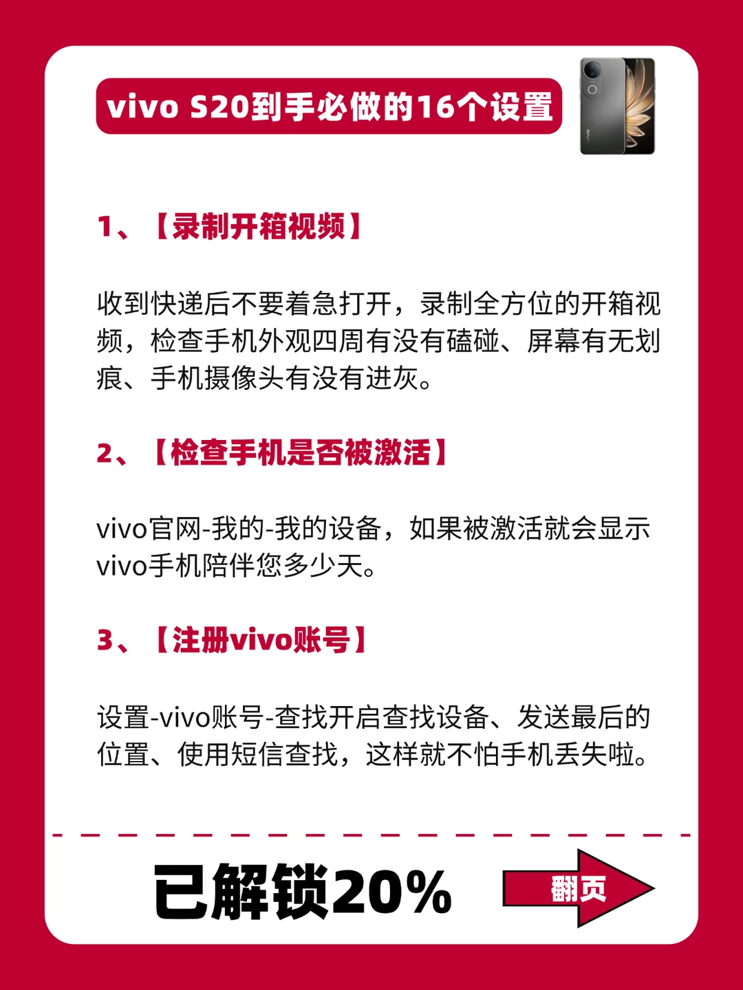 - 嗨~姐妹! 买了vivos20或者准备买的姐妹看到这篇,一定要🐴住! 想让手机更丝滑,千万别忘了做这16个设置! 豆豆今天已经给大家整理好了,每一个必做设置都老好用了!!快去设置起来叭[赞R] -