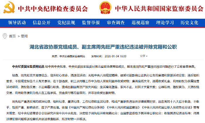 周先旺严重违反党的政治纪律、组织纪律、廉洁纪律、工作纪律和生活纪律,构成严重职务违法并涉嫌受贿犯罪,且在党的十八大后不收敛、不收手,性质严重,影响恶劣,应予严肃处理。依据《中国共产党纪律处分条例》《中华人民共和国监察法》《中华人民共和国公职人员政务处分法》等有关规定,经中央纪委常委会会议研究并报中共中央批准,决定给予周先旺开除党籍处分;由国家监委给予其开除公职处分;收缴其违纪违法所得;将其涉嫌犯罪问题移送检察机关依法审查起诉,所涉财物一并移送。(总台央视记者宋琎)