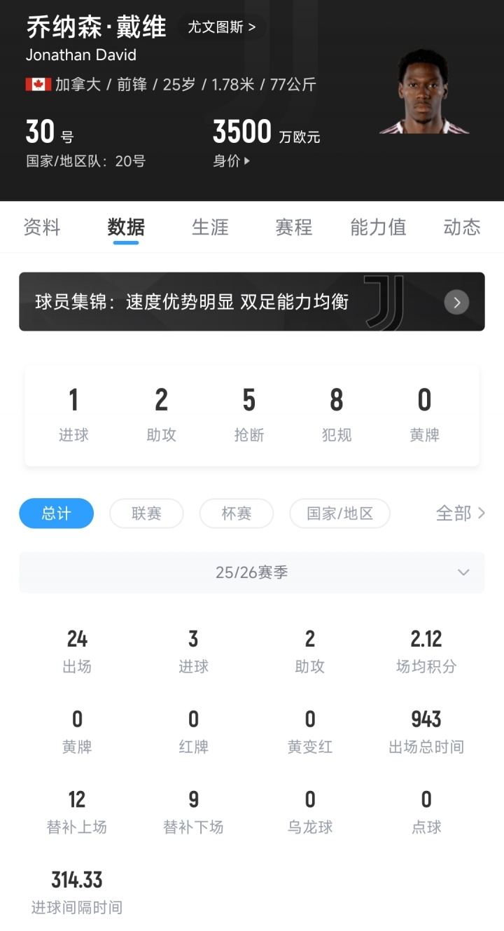 去年夏窗戴维自由身加盟尤文,在意甲首轮攻破帕尔马球门后,16场意甲一球未进,赛季至今各赛事24场3球2助,而上赛季他在法甲球队里尔的数据为49场25球12助。