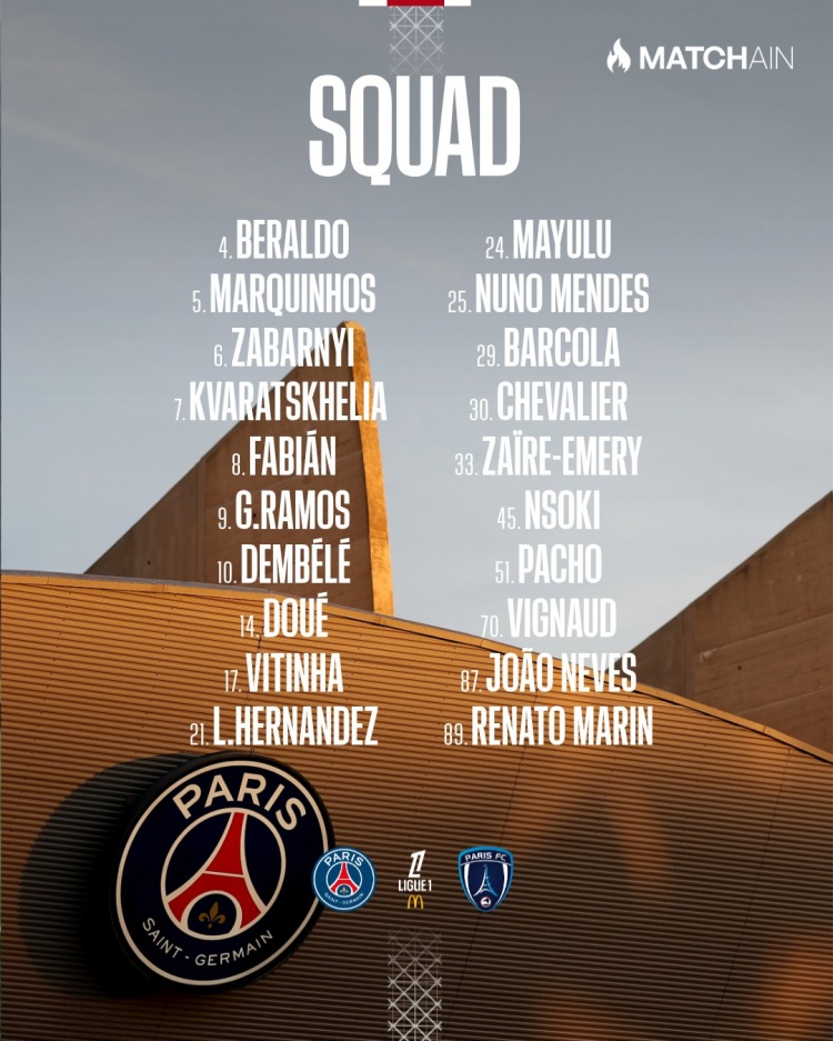 直播吧1月4日讯北京时间明天凌晨,巴黎圣日耳曼将在法甲第17轮比赛中主场对阵巴黎FC。巴黎圣日耳曼公布了此役的球员名单,