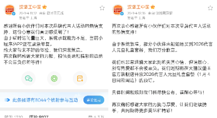 而在第二条致歉中,官方称“由于系统故障,部分小伙伴未能如愿买到2026代言人元旦礼盒套餐,我们万分歉意。我们也非常理解大家此刻的失落心情,但请放心,所有热爱都不会被辜负。我们近期将在天猫汉堡王官方旗舰店开放2026代言人元旦礼盒套餐(1月4日同款周边)的预订。”