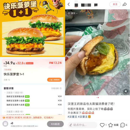实际上,这并非汉堡王近期唯一一次因营销活动引发争议。就在不久前,汉堡王与知名动画IP《海绵宝宝》的联名产品推出后,因品质与宣传不符引发消费者不满。12月上旬,汉堡王中国推出了海绵宝宝主题的限量套餐,其中包括一款被宣传为“菠萝堡”的汉堡。然而,有消费者发现实际产品与宣传图存在明显差异:宣传图上的汉堡配有大量菠萝,而实物汉堡中菠萝分量却非常少,让许多粉丝大失所望,纷纷在社交媒体上吐槽“菠萝大皇堡根本没有菠萝”,质疑官方宣传与实物差距过大,存在“照骗”情况。