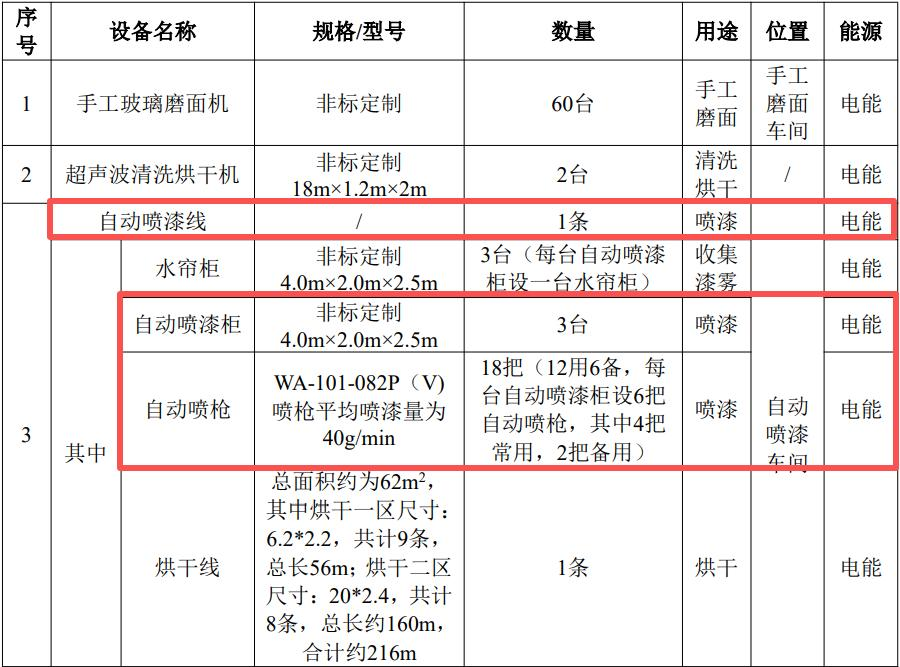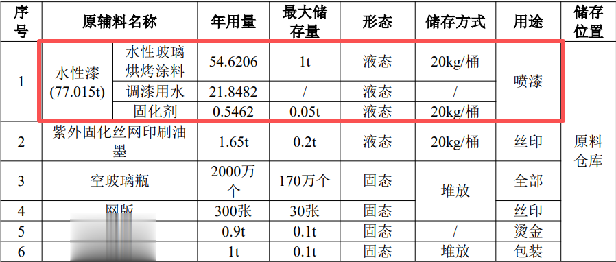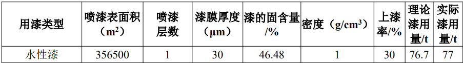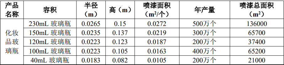 本项目使用大流量低压力(HVLP)喷枪喷涂,参考《涂装工艺及车间设计手册》(傅绍燕编著,机械工业出版社,2012年出版)P204,大流量低压力(HVLP)涂料利用率大于65%;参考《涂装工艺与设备》(冯立明,化学工业出版社2013年版),空气喷涂方式,对于管状态、小件的物料,涂料利用率为15%-30%。综合考虑两份参考文献,结合项目喷涂物料,玻璃本身属于不规则的结构,故上漆率保守取30%计算。本项目用漆量计算如下表。