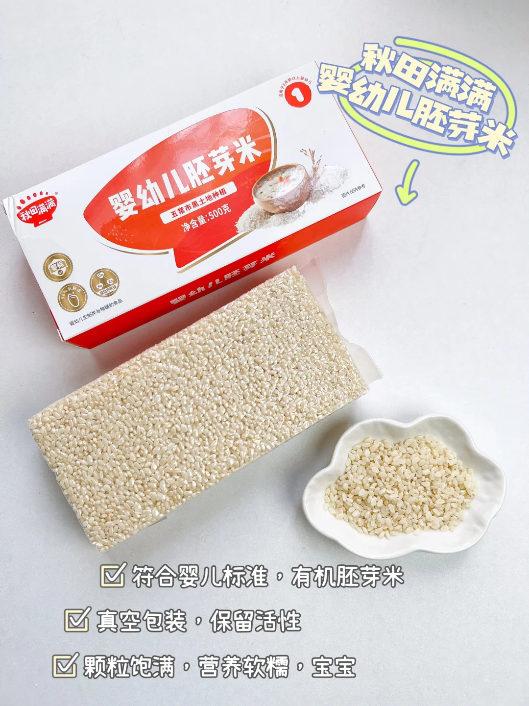 为了宝宝的营养,我用的是秋田满满有机胚芽米,留胚率很高,含有肉眼可见的胚芽,营养价值更高~煮出来的粥软糯,煮的时候还会散发一股浓厚米香。每次买到的胚芽米日期都很新鲜,保证了胚芽活性,宝宝也爱吃。